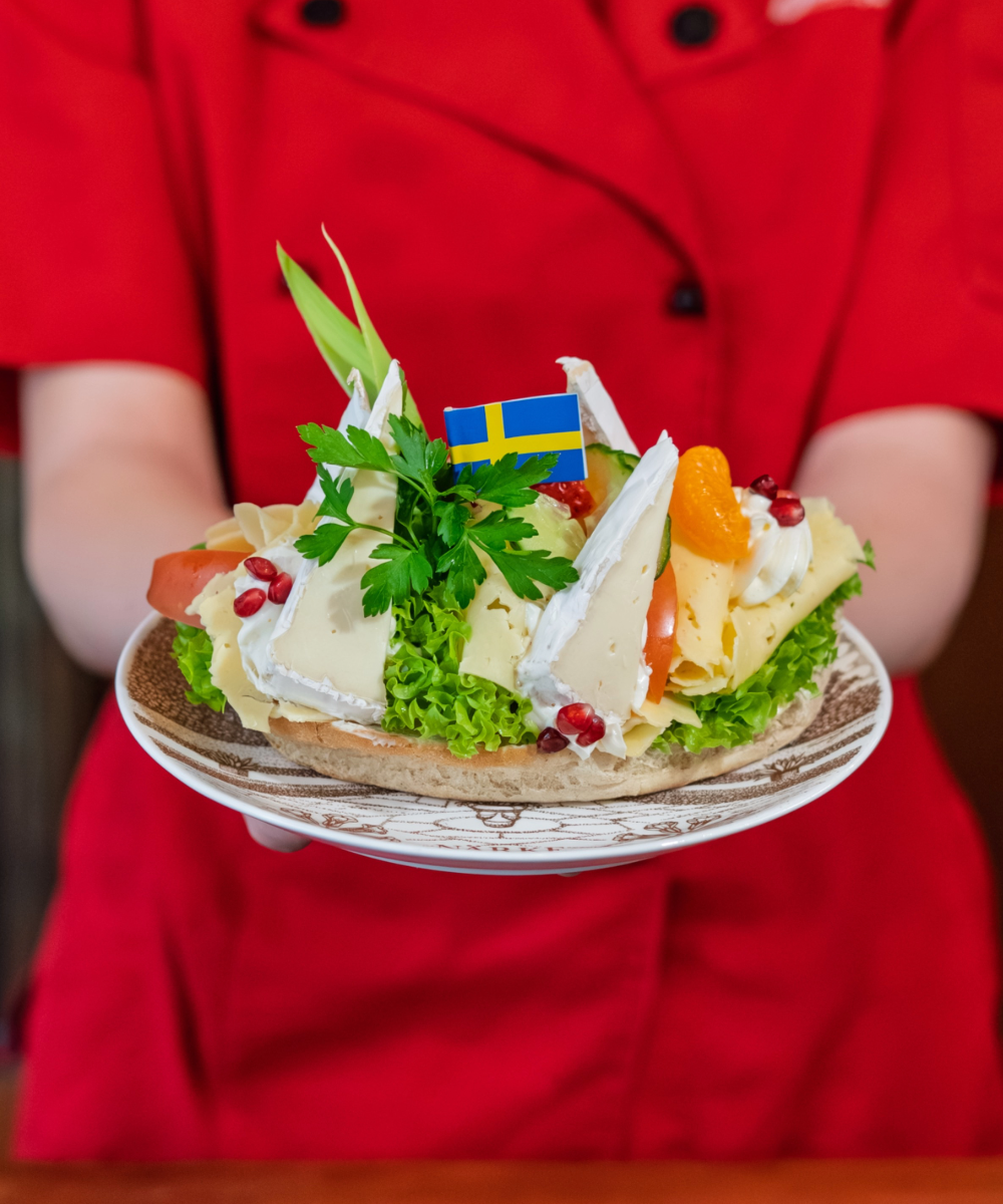 Rågkaka med smör, gräddost, ostkräm, brieost och grönsaker.